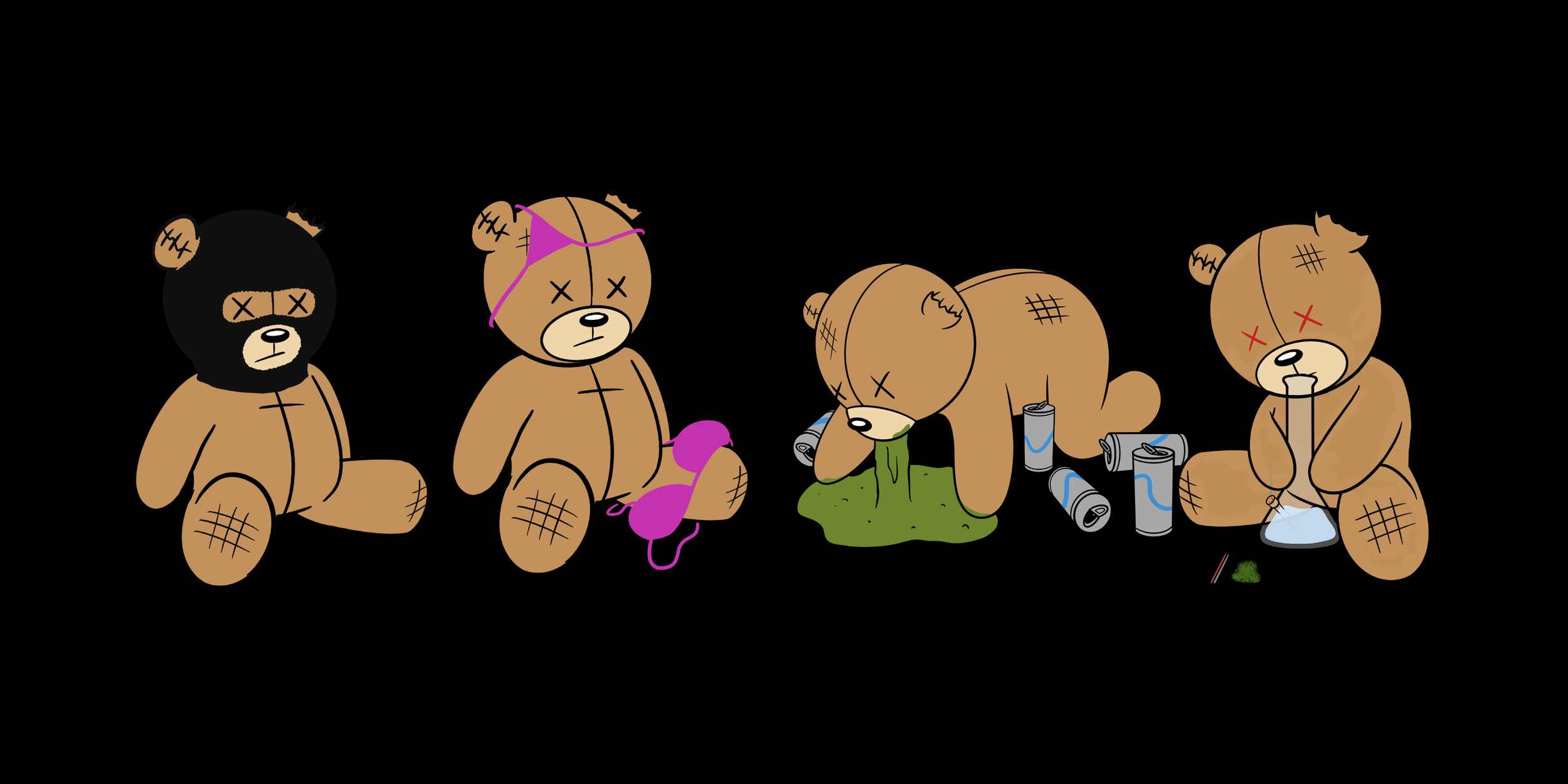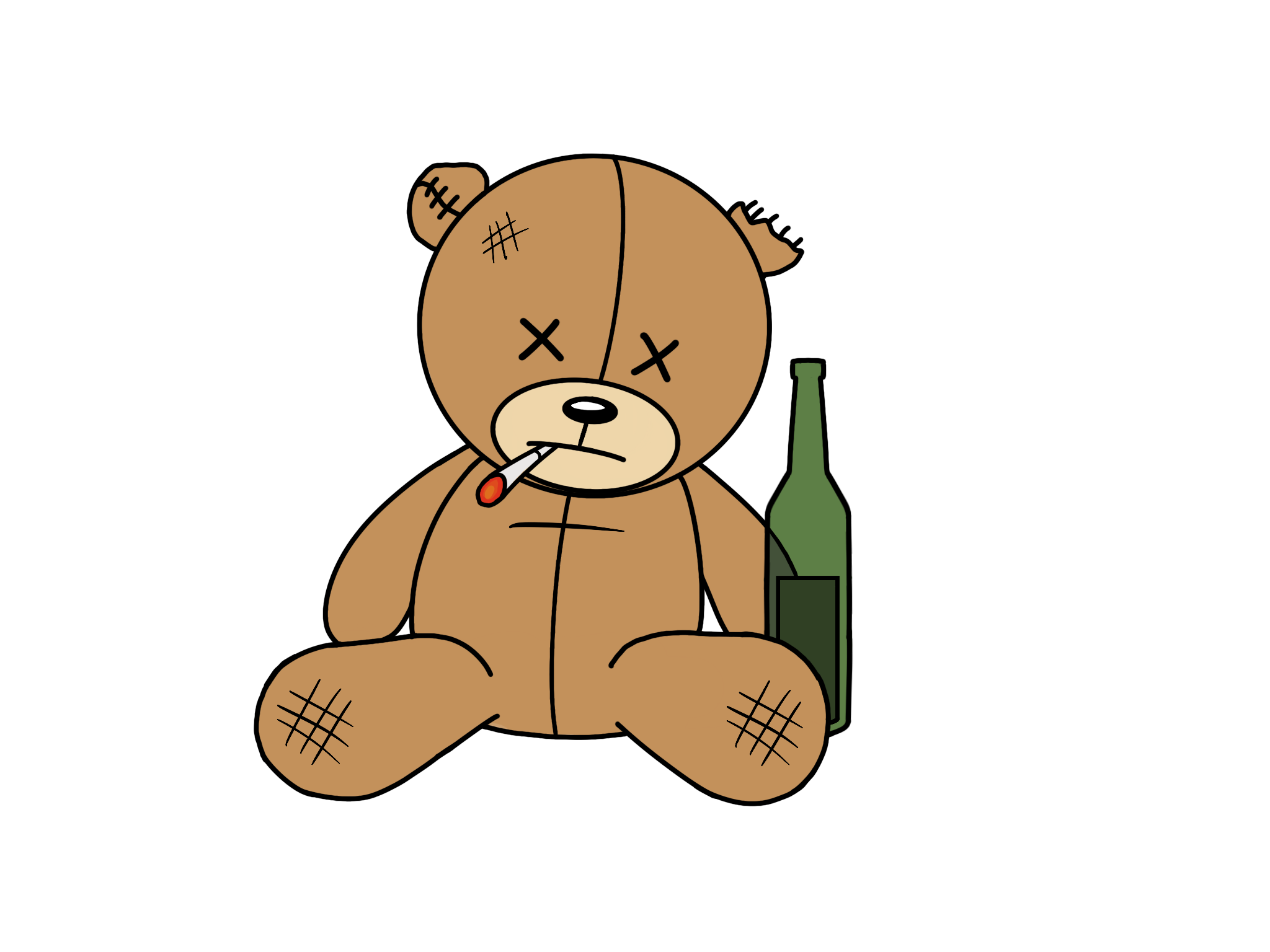 He's the brand made flesh. Patched, stitched, X-eyes, cigarette in his mouth, bottle by his side. Every drop gives him a new look — gambler, gym rat, passed out, send-it incarnate. He doesn't ask for sympathy. Neither do we.